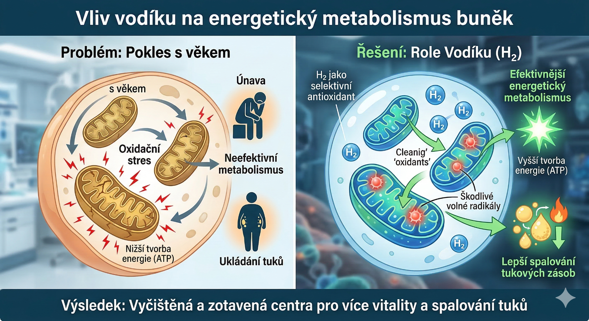 Po čtyřicítce v těle přirozeně narůstá hladina oxidativního stresu a klesá efektivita buněčných elektráren (mitochondrií). To vede k únavě a snadnějšímu přibírání (zejména v oblasti břicha). Vodík díky své minimální molekulární velikosti proniká až do nitra buněk, kde tyto procesy zvrátí. Pomáhá tak tělu vrátit se do stavu "metabolického mládí", kdy byla tvorba energie efektivnější.