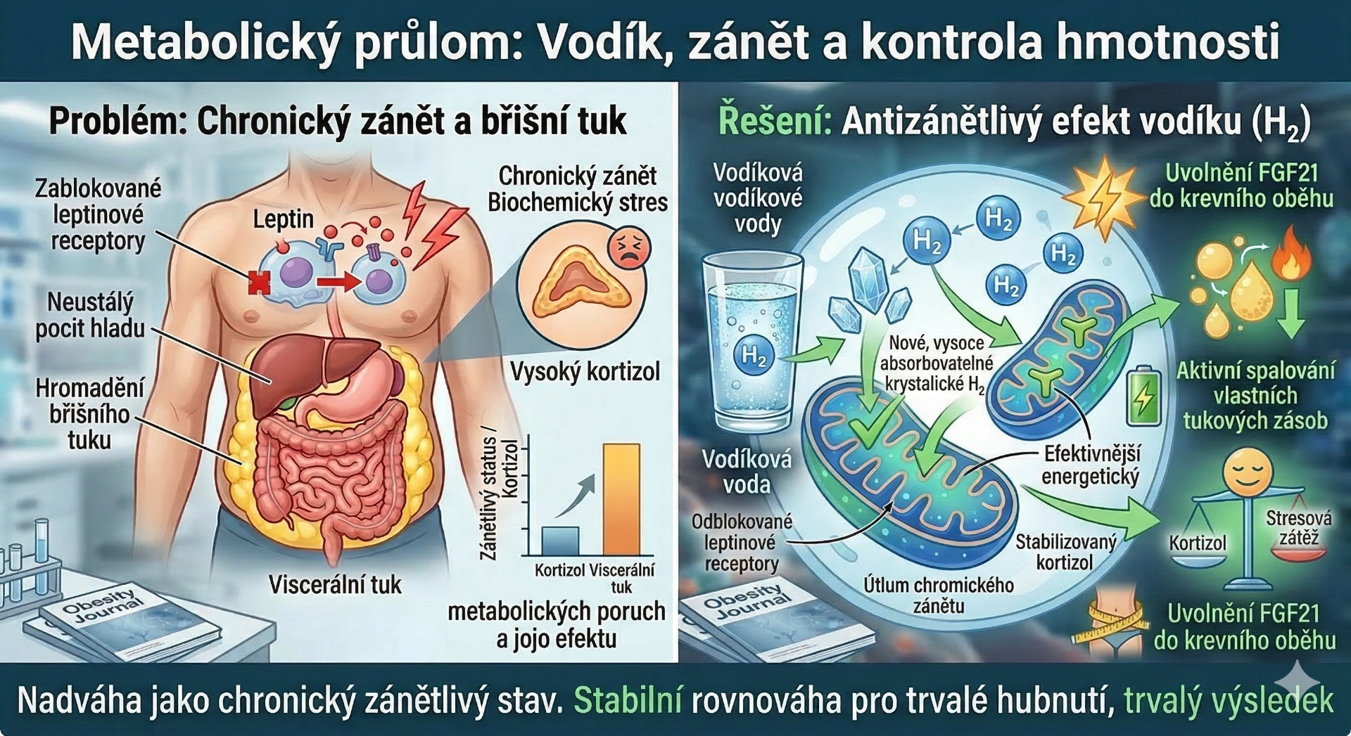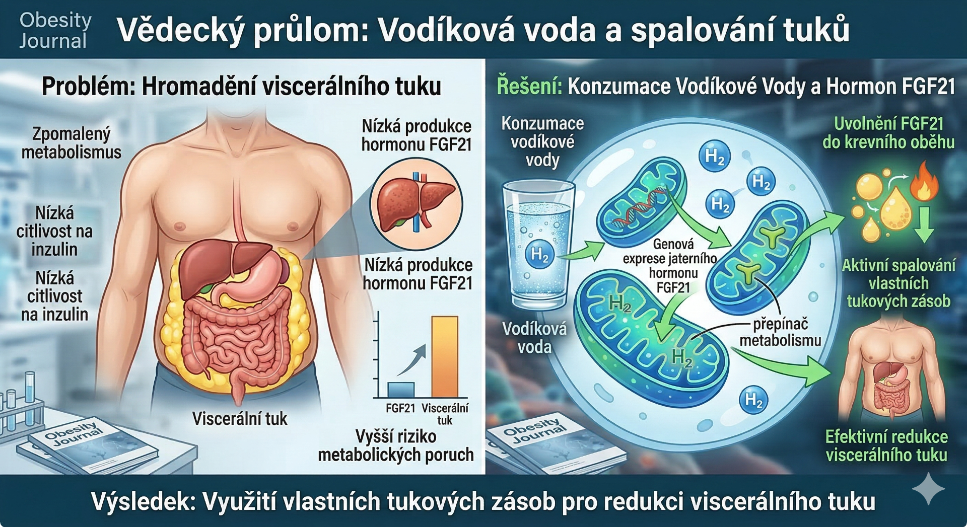 Klinický přesah: Vodík tak pomáhá tělu využívat vlastní tukové zásoby jako primární zdroj energie, což je klíčové pro redukci tzv. viscerálního (vnitřního) tuku.