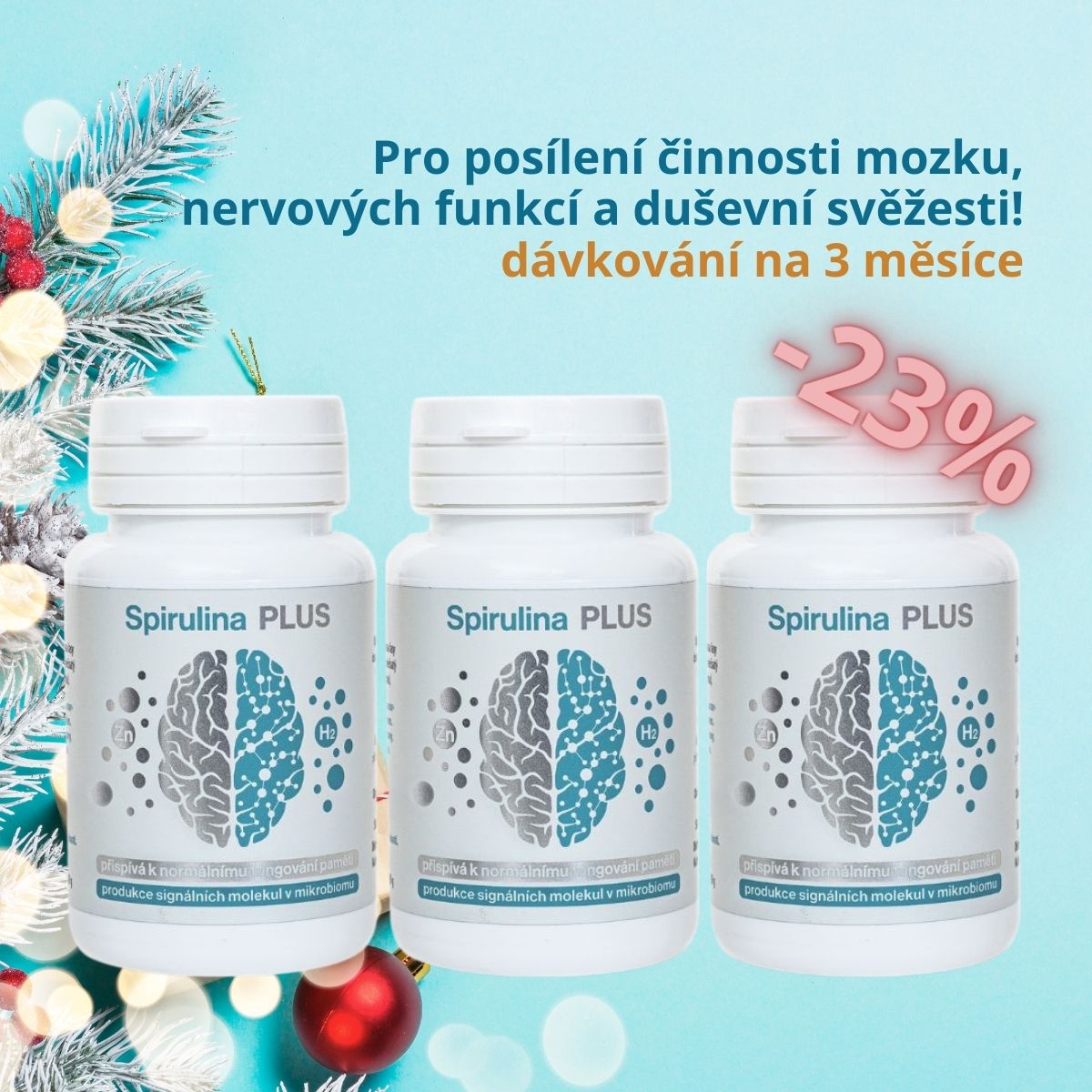 Výhodné balení - dávka na 3 měsíce! Unikátní kombinace Spiruliny , biomasy Haematococcus pluvialis s vysokým obsahem asthaxanthinu a Zinku představuje skvělý komplex pro posílení činnosti mozku, nervových funkcí a duševní svěžesti. Obsahuje antioxidanty a fytonutrienty pro podporu imunity, trávení a kognitivních funkcí. Kombinace Spirulina PLUS je tak ideální pro seniory i aktivní jedince, kteří chtějí žít naplno do vysokého věku.